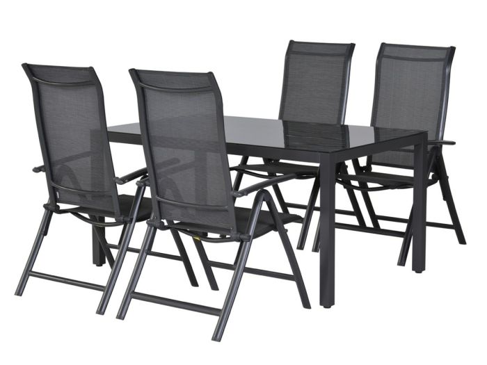Sie können die Rückenlehne der Stühle durch die Bedienung der Armlehnen verstellen. Der Stuhl kann in vier verschiedene Positionen verstellt werden. Die Stühle bestehen aus Aluminium in der Farbe matt Carbon Blalck und sind mit Allwetter Texti ausgestattet. Der Tisch mit der Glasplatte hat eine Größe von 150 x 90 cm.