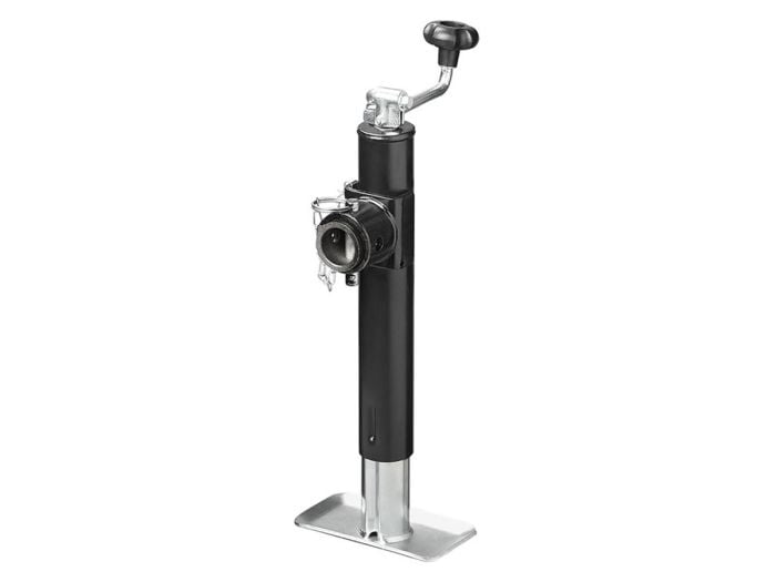 Stützfuß für Anhänger- oder Wohnwagendeichsel. Stabilisieren Sie Ihren Wohnwagen oder Anhänger schnell und einfach mit dieser Deichselstütze aus verzinktem Stahl. Wenn die Deichsel nicht mit einem Bugrad ausgestattet ist, ist dieser Stützfuß die Lösung. Mit Hilfe der Kurbel lässt sich die Stütze von 39 cm auf eine Höhe von 64cm ausdrehen und ist mit einer maximalen Tragfähigkeit von 1000 kg für fast alle Deichseln geeignet. Spezifikationen: - Max. 1000 kg - Min. - Max. Höhe: 39-64 cm - Rohr: ca. Ø57 mm - Maße Bodenplatte: ca. 180 x 100 mm - Mit Obenschlinger (nicht abnehmbar) - Ausdrehbar und klappbar - Inkl. Sicherungsbolzen - Inkl. verschweißbare Adapter / Flansch - Material: Stahl verzinkt/pulverbeschichtet
