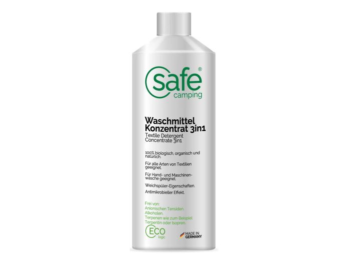 SAFE CAMPING Waschmittel-Konzentrat 3in1 ist ein Textil-Waschmittel für die Maschinen- und Handwäsche. Es handelt es sich um ein Feinwaschmittel, mit welchem auch Seide, Kaschmir und andere, spezielle Stoffarten via Handwäsche gereinigt werden können. Das Reinigungssystem basiert auf einem Biopolymer-Absorptionsprinzip – ohne Tenside. Es hat reinigende und zugleich antimikrobielle Wirkung. SAFE CAMPING Waschmittel-Konzentrat 3in1 ist hypoallergen, lebensmittelecht und schleimhautverträglich, sowie kinder-, säuglings- und tiersicher