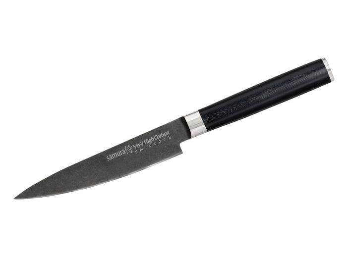 Das Samura Mo-V Allzweckmesser ist ein kleines Küchenmesser mit schlankem Design. Die Klinge besteht aus hochwertigem AUS-8-Edelstahl mit Stonewash-Finish. Diese ursprünglich japanische Stahlsorte ist für ihre Zähigkeit und Schärfebeständigkeit bekannt. Der Griff besteht aus poliertem G10. Die Balance des Messers befindet sich auf der Rückseite, sodass das Messer beim Schneiden gut in der Hand liegt. Dieses Universalmesser eignet sich perfekt zum Schneiden von Gemüse, Obst, Fisch und Fleisch. Am längsten bleibt das Messer schön, wenn es nicht in der Spülmaschine gereinigt wird.