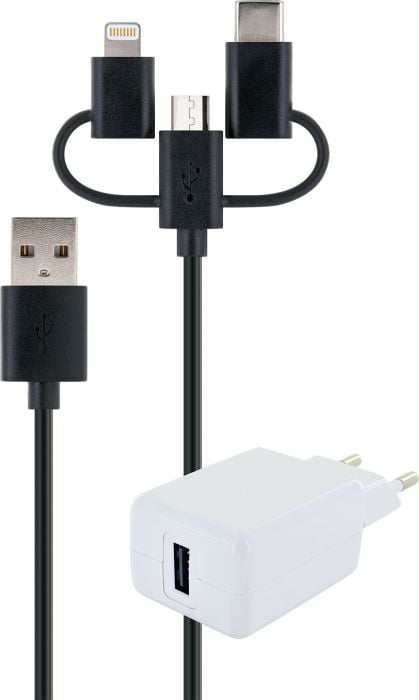 Dieses Schwaiger 230 volt 3-in-1 smart Ladesett ist für das Laden aller mobilen Endgeräte an einer 230 V Steckdose konzipiert. Es besteht aus einem 3-in-1 Sync & Ladekabel, welches sowohl für Apple Geräte mit Lightning-Anschluss als auch für Geräte mit Micro USB- oder USB Type C-Anschluss geeignet ist, sowie einem 230 V Ladeadapter. Dieser überzeugt durch eine intelligente Steuerung des Ladestroms, da er sich automatisch an den aktuellen Energiebedarf des Gerätes anpasst. Hierdurch werden im Vergleich zu herkömmlichen Ladeadaptern deutlich kürzere Ladezeiten erzielt.