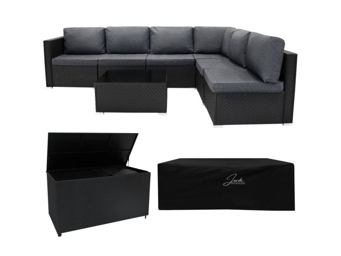 Verwandeln Sie Ihren Außenbereich in eine stilvolle und funktionale Oase mit diesem eleganten schwarzen Rattan-Modular-Möbelset, das mit einer passenden 996L Aufbewahrungsbox für mühelose Organisation ausgestattet ist.
