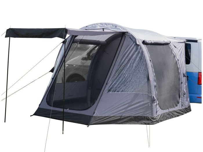 Das Zelt bietet die perfekte Möglichkeit den Wohnraum in einem Van oder Minivan ganz einfach zu vergrößern und erlaubt einen ungestörten Zugang zum Fahrzeug durch die seitliche Schiebetür. Das Zelt kann zudem auch freistehend verwendet werden: Tagestouren mit dem Auto sind also möglich, ohne dass das Zelt komplett abgebaut werden muss. Das Zelt wird einfach laut Anleitung aufgestellt und kann bei einem Ausflug an der Verbindung zum Fahrzeug gelöst werden, sodass das Fahrzeug wegfahren kann. Ein zusätzlicher Reißverschluss an der Rückseite des Zeltes sorgt dafür, dass das Zelt komplett geschlossen werden kann.