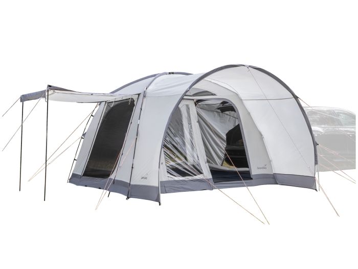Das durchdachte Single-Skin-Kuppelzelt für bis zu vier Personen überzeugt bereits als freistehendes Stand-alone-Zelt mit großen Panoramafenstern einer cleveren Multifunktionstür unter einem fest integrierten Vordach mit Seitenwänden sowie einem seitlichen Eingang der sich zum Sonnendach umfunktionieren lässt. Die Schleuse wird über robuste Reißverschlüsse am Zelt befestigt damit ein perfekt passendes Autovorzelt entsteht. Die Abspannleinen lassen sich unkompliziert und werkzeugfrei am Fahrzeug befestigen – ganz ohne spezielles Zubehör. Die Schleuse ermöglicht einen direkten geschützten Zugang zum Fahrzeug an der geöffneten Heckklappe und ist passend für die meisten gängigen SUV-Modelle.