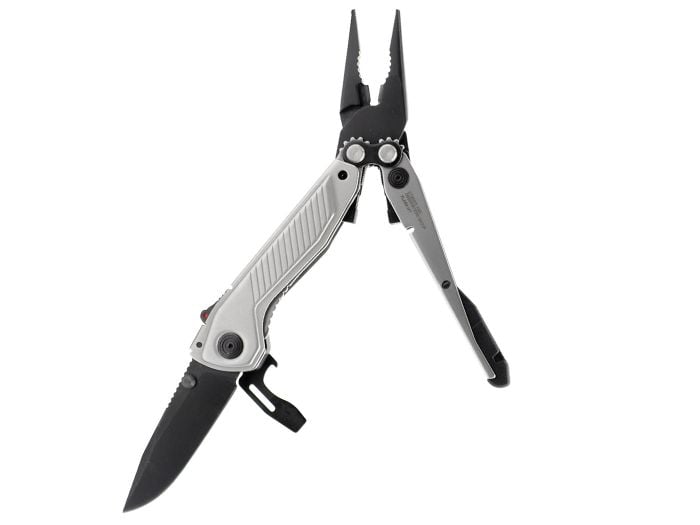 Das SOG Flash MT ist ein modern gestaltetes Multitool mit dem kompakten Formfaktor eines Taschenmessers. Lösen Sie Probleme, sobald sie auftreten. Seien Sie nie ohne Werkzeug, wenn Sie es unterwegs oder zu Hause brauchen. Das von außen zugängliche, arretierbare Messer mit Öffnungshilfe macht das Schneiden zum Kinderspiel. Die Klinge besteht aus D2-Stahl. Diese Stahlsorte ist für ihre außergewöhnliche Zähigkeit bekannt und zählt zu den besten Allround-Stahlsorten. Mit der Kombizange können Sie aufgrund des patentierten Zahnradgetriebes von SOG eine größere Kraft ausüben als mit anderen Werkzeugen. Die mitgelieferten Bits können im Werkzeug aufbewahrt werden,