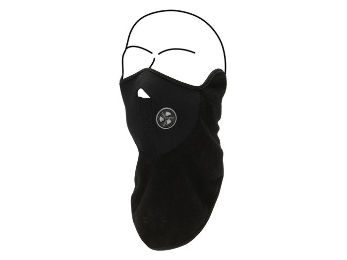 Der Gesichtsschützer hat eine Mundkappe aus Neopren und Belüftungsöffnungen aus Gummi. Außerdem ist er mit einem Klettverschluss im Nacken ausgestattet.