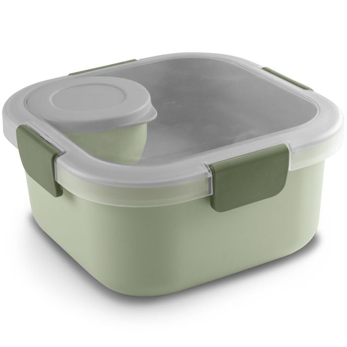 Verwenden Sie das Set z. B. als Salatschüssel, Brotdose oder zum Aufwärmen Ihrer warmen Mahlzeit, wobei unterschiedliche Zutaten getrennt aufbewahrt werden können. Die Salatsoße oder Pinienkerne im Mini-Behälter und die Tomaten und Gurken auf dem Tablett, der Salat unten. Das Tablett kann auch als Teller verwendet werden.