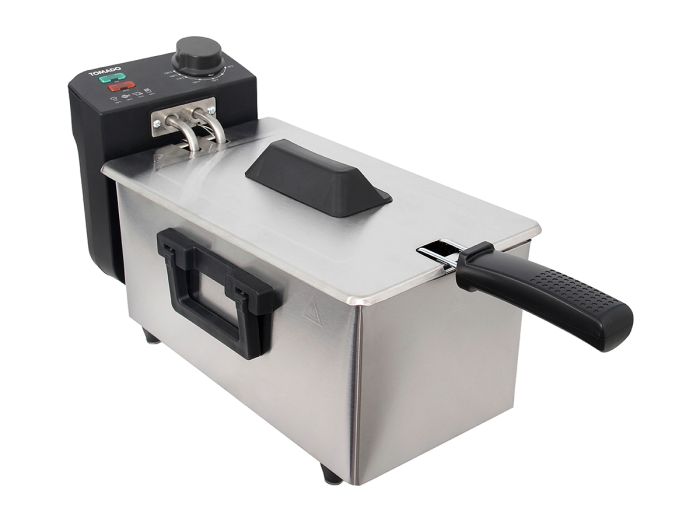 Die Tomado Kaltzonen-Fritteuse TDF3000S hat ein Fassungsvermögen von 3Litern und eine Leistung von 2000Watt. Die Temperatur lässt sich ganz einfach mit dem Drehknopf bis maximal 190°C einstellen. Die Fritteuse verfügt über einen herausnehmbaren Innenbehälter und ein Gehäuse aus Edelstahl.Das Heizelement hängt direkt im Öl, wodurch deine Mahlzeiten besonders knusprig werden! Nach dem Gebrauch lässt sich die Fritteuse leicht reinigen und hat spülmaschinenfeste Teile.