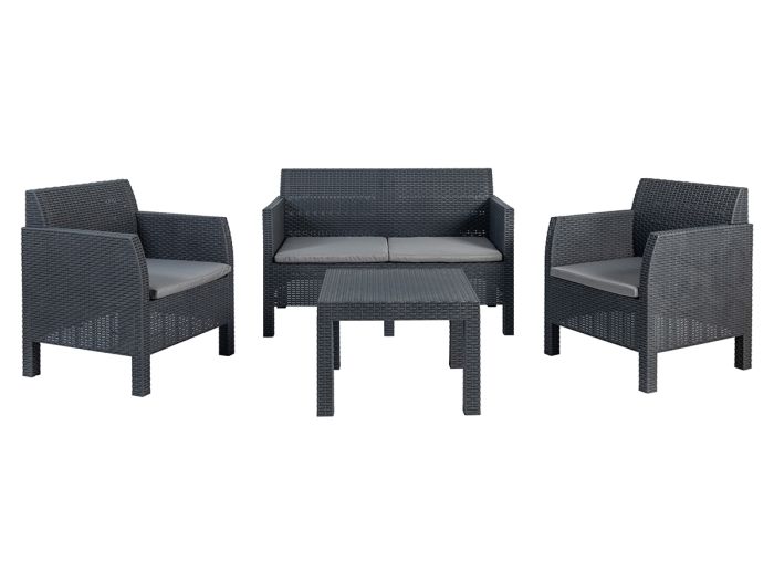 Toomax Mathilde Sitzgarnitur - 4 Sitze - anthrazitErfreuen Sie sich an Ihrem eigenen Garten mit dem Toomax Mathilde Lounge-Set. Dieses Set besteht aus 2 geräumigen Stühlen, einem 2-Sitzer-Sofa und einem Tisch. Die Bank und die Stühle haben ein schönes Sitzkissen für optimalen Sitzkomfort. Die Stühle sind einfach und ohne zusätzliches Werkzeug zu montieren.