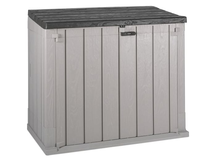 Toomax Stora Way Aufbewahrungsbox - 842L - hellgrau/anthrazitDie Toomax Stora Way Aufbewahrungsbox ist die perfekte Lösung für die Lagerung von Kissen, Gartenzubehör und Papierkörben in Ihrem Garten oder auf Ihrer Terrasse. Diese stilvolle und funktionelle Aufbewahrungsbox bietet eine Kombination aus Benutzerfreundlichkeit, Haltbarkeit und attraktivem Design. Die Box kann durch die beiden Türen, aber auch durch den Klappdeckel geöffnet werden. Ihr großes Volumen bietet genügend Platz für Gartenkissen oder verschiedene Gartengeräte sowie zwei 120-Liter-Behälter. Die Aufbewahrungsbox ist mit einem Vorhängeschloss versehen, so dass Sie sie komplett abschließen können. (Vorhängeschloss nicht im Lieferumfang enthalten).