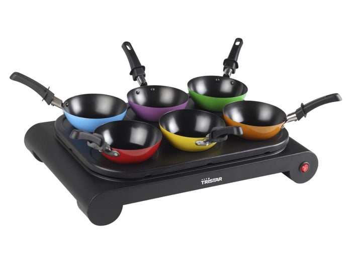 Das Wok-Set bunte Pfännchen für bis zu sechs Personen. In der Backplatte sind praktische Wölbungen integriert, damit Sie auch Pfannkuchen backen können. Mit sechs Spatel und einem Löffel.