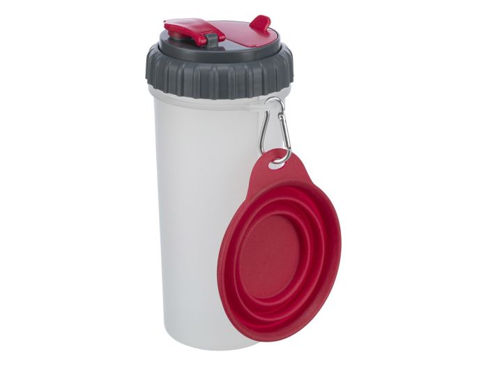 Für zusätzlichen Komfort unterwegs wird dieser Behälter mit einer faltbaren Silikon-Reiseschale geliefert, mit der Sie schnell und einfach füttern und tränken können. Dank des praktischen Karabinerhakens können Sie den Behälter mühelos an Ihrem Rucksack, Gürtel oder Ihrer Reisetasche befestigen. Hergestellt aus strapazierfähigem Kunststoff und flexiblem Silikon, ist dieses Produkt leicht, robust und einfach zu reinigen.