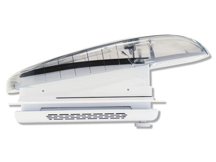 Der Dachventilator ist mit einem Fliegengitter, einem verdunkelnden Plissee und einer LED-Beleuchtung im Unterrahmen ausgestattet. Der Luxuoso ist leichter und leiser als alle anderen vergleichbaren Dachventilatoren.