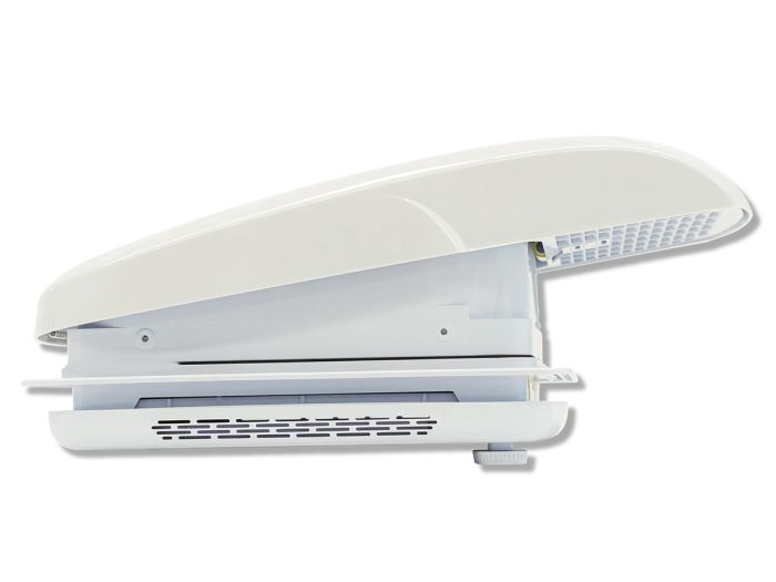 Der Dachventilator ist mit einem Fliegengitter, einem verdunkelnden Plissee und einer LED-Beleuchtung im Unterrahmen ausgestattet. Der Luxuoso ist leichter und leiser als alle anderen vergleichbaren Dachventilatoren.