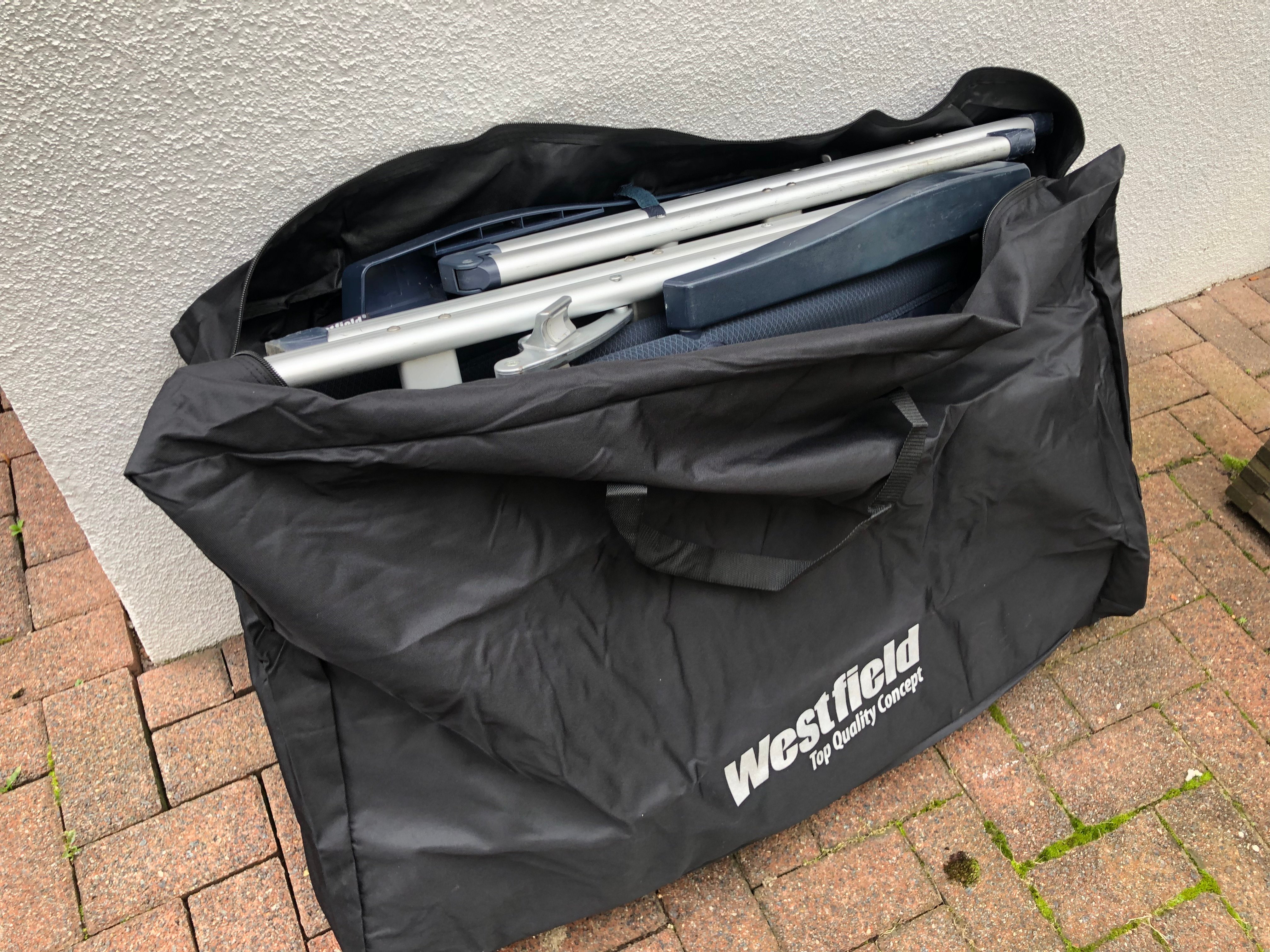 - Super Tasche top QualitätIch habe Westfield Stühle mit Fußauflage es passt alles in die Tasche 2 mal Stuhl mit Auflage, lässt sich leicht verschließen die Tasche macht einen hochwertigen Eindruck ist zu empfehlen!
