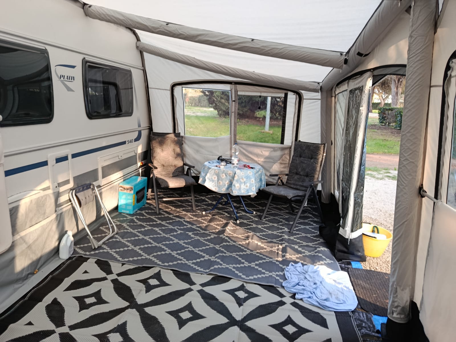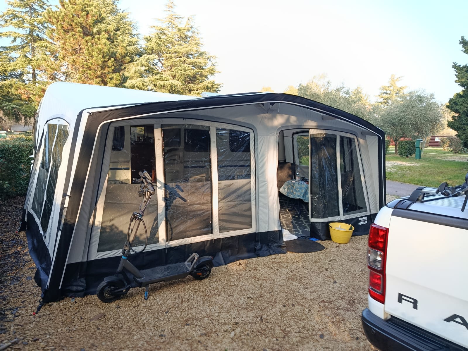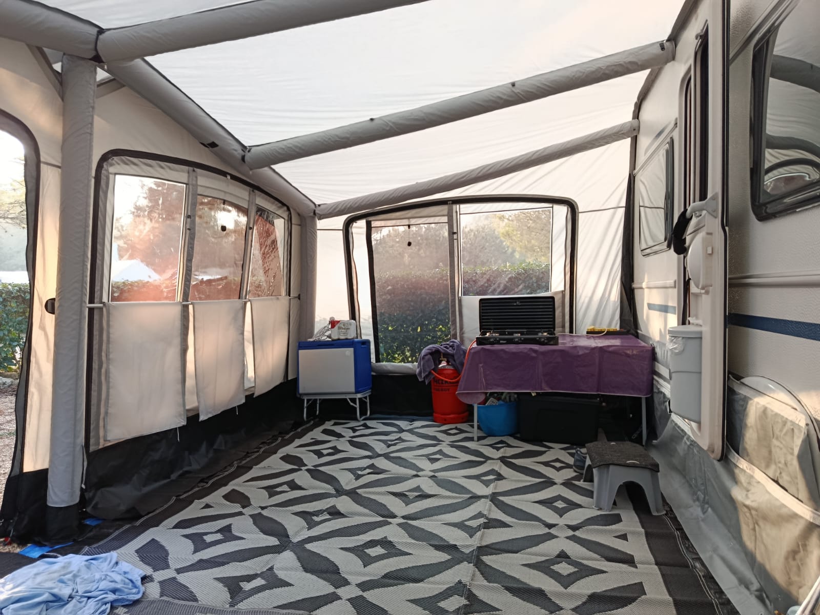 Ein Dachüberstand, der bei den meisten traditionellen Wohnwagenvorzelten erhalten ist.