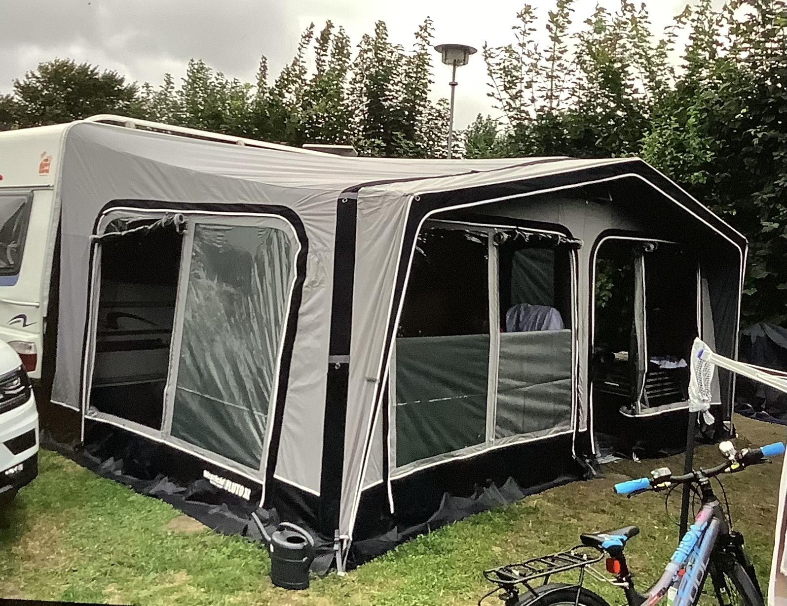 Das Westfield Pluto XL in Größe 8 ist ein extra tiefes aufblasbares Vorzelt für Wohnwagen mit einem Umlaufmaß von 946 bis 980 cm, das den ganzen Wohnwagen bedeckt.