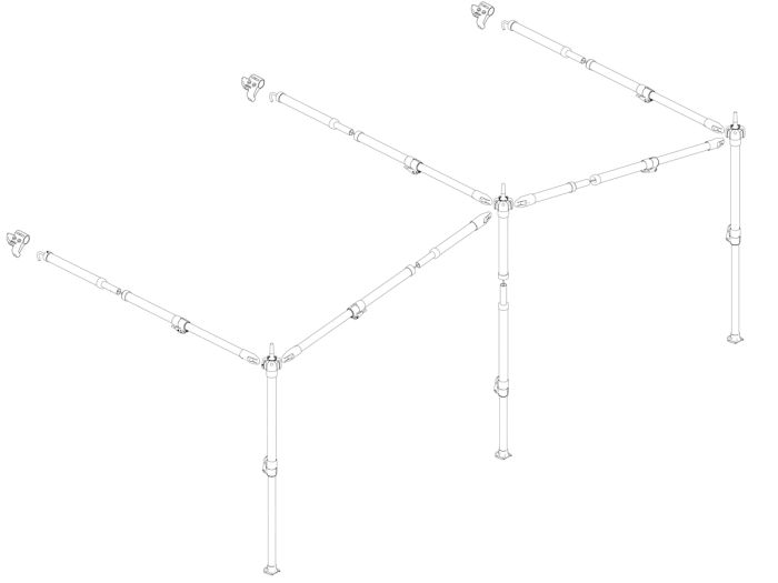 Das Gestänge beinhaltet drei Ständer und drei Dachträger. Mit den mitgelieferten F-Gliedern können Sie das Vordachgestänge mit dem Vorzeltgestänge Ihres Isabella oder Ventura Vorzeltes verbinden.
