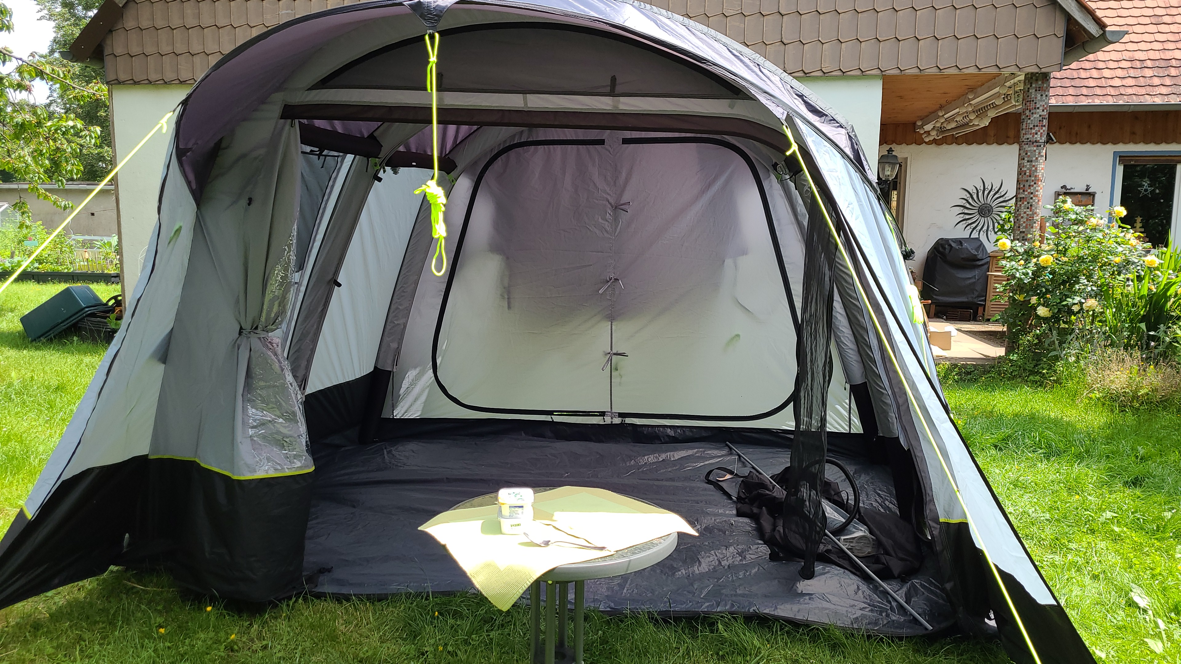 Der (überdachte) Raum zwischen dem Zelt und dem Fahrzeug.