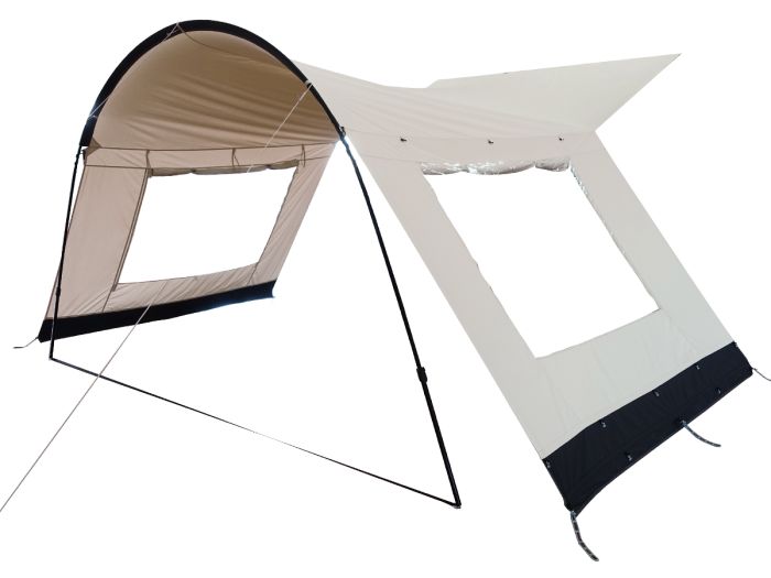 Das Zeltvordach ist mit aufrollbaren Seitenwänden mit Fenster ausgestattet. Dadurch sind Sie flexibel und können selbst wählen, wie viel Schutz Sie benötigen. Für zusätzliche Privatsphäre können die Fenster vollständig von innen abgedeckt werden. Dank des atmungsaktiven Polycotton-Zelttuchs bleibt an heißen Sommertagen keine Hitze in dem Vordach.