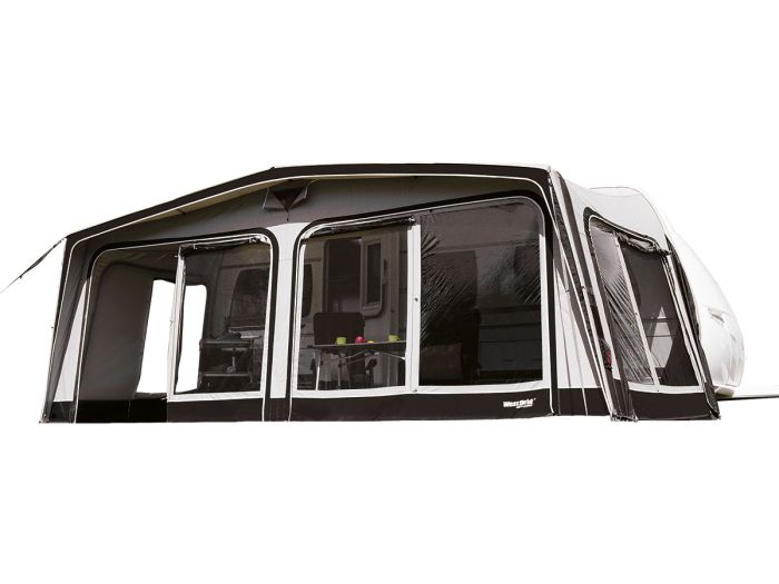 Das Zweite Chance Wohnwagenvorzelt Westfield Pluto Größe 11 (1051 - 1085 cm) ist ein aufblasbares Vorzelt für Wohnwagen mit einem Umfang von 1051 bis 1085 cm und einer Tiefe von 250 cm, das den gesamten Wohnwagen abdeckt.