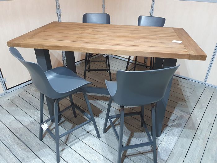 Robust und stilvoll! Wir nennen diesen Zweite Chance Yasmani Bartisch den idealen Partner, um warme Sommerabende zu genießen. Die robuste Tischplatte des Tisches besteht aus Teakholz. Teakholz hat ein natürliches Aussehen und ist ein langanhaltendes Material. Der Tisch können Sie das ganze Jahr über draußen stehen lassen, allerdings bekommen die Tischplatte dann eine vergraute Glut. Wenn Sie die natürliche Farbe des Tisches beibehalten möchten, dann müssen Sie die Tischplatte behandeln. Mit 4 Sophie Barstuhle. 1 Barstuhl hat eine andere Form.